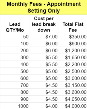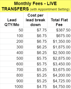 Appointment Setting vs. Live Transfers: Live transfers are 75¢ per lead more. With live transfers we will still set appointments for leads who are not ready for a transfer at that moment. Transfers cost more because it requires more of our time to execute.
